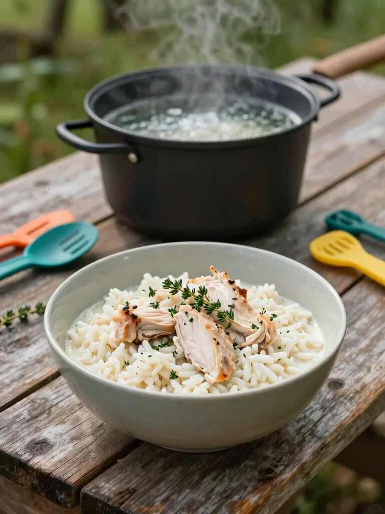 Looking for a dish that combines comfort and flavor? This creamy chicken and rice is just what you need for a satisfying camping meal. Tender chicken, aromatic herbs, and fluffy rice come together in a rich, creamy sauce that will please everyone at your campsite. It’s easy to make and perfect for a cozy dinner under the stars.