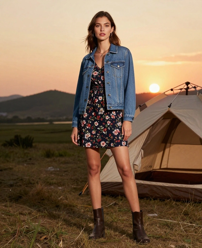 A classic denim jacket layered over a floral dress creates a camping outfit that’s both cute and practical. The denim jacket adds warmth and transforms a summer dress into a versatile piece for various seasons.