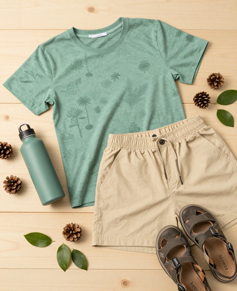 Start your outdoor journey in an organic cotton tee paired with recycled shorts. This classic duo is perfect for keeping you cool and comfortable while being kind to the planet. The breathable fabrics make it a go-to for both hiking and relaxing at your campsite after a day of exploration.