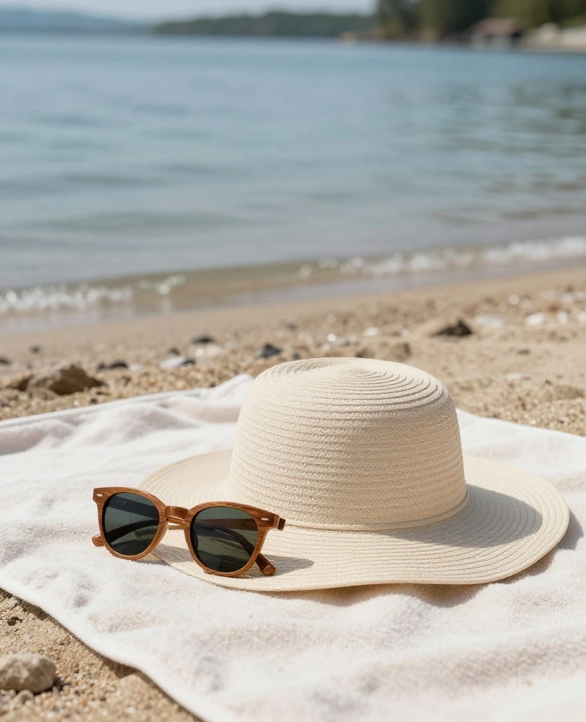 – Wide-brimmed sun hat in natural colors (adjustable for a secure fit)