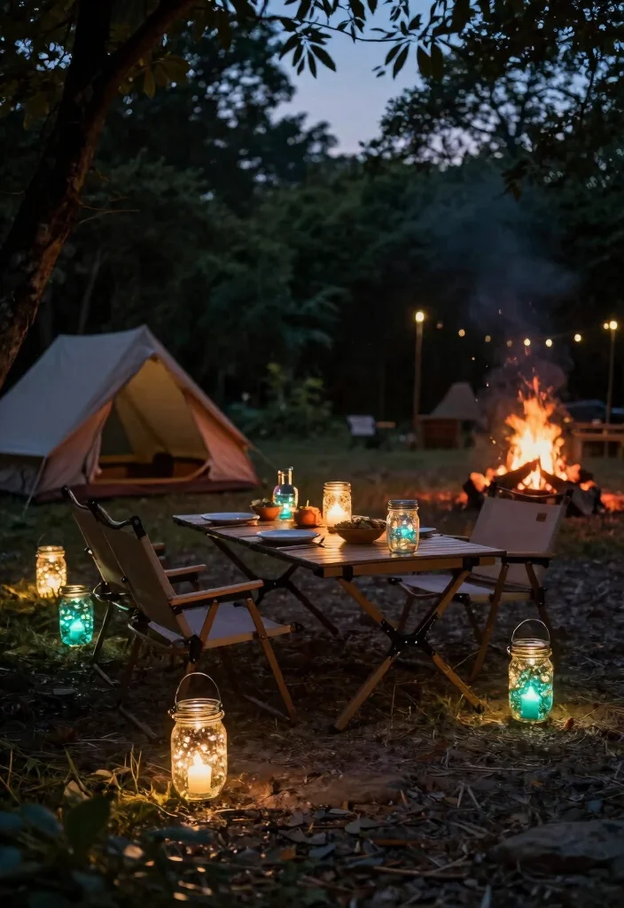 Add a warm glow to your campsite with charming campfire lanterns made from simple jars. By placing LED tealights or candles inside, you can create beautiful lighting that also helps keep bugs at bay. Mason jars bring a rustic touch, perfect for late-night storytelling or enjoying peaceful evenings under the stars.