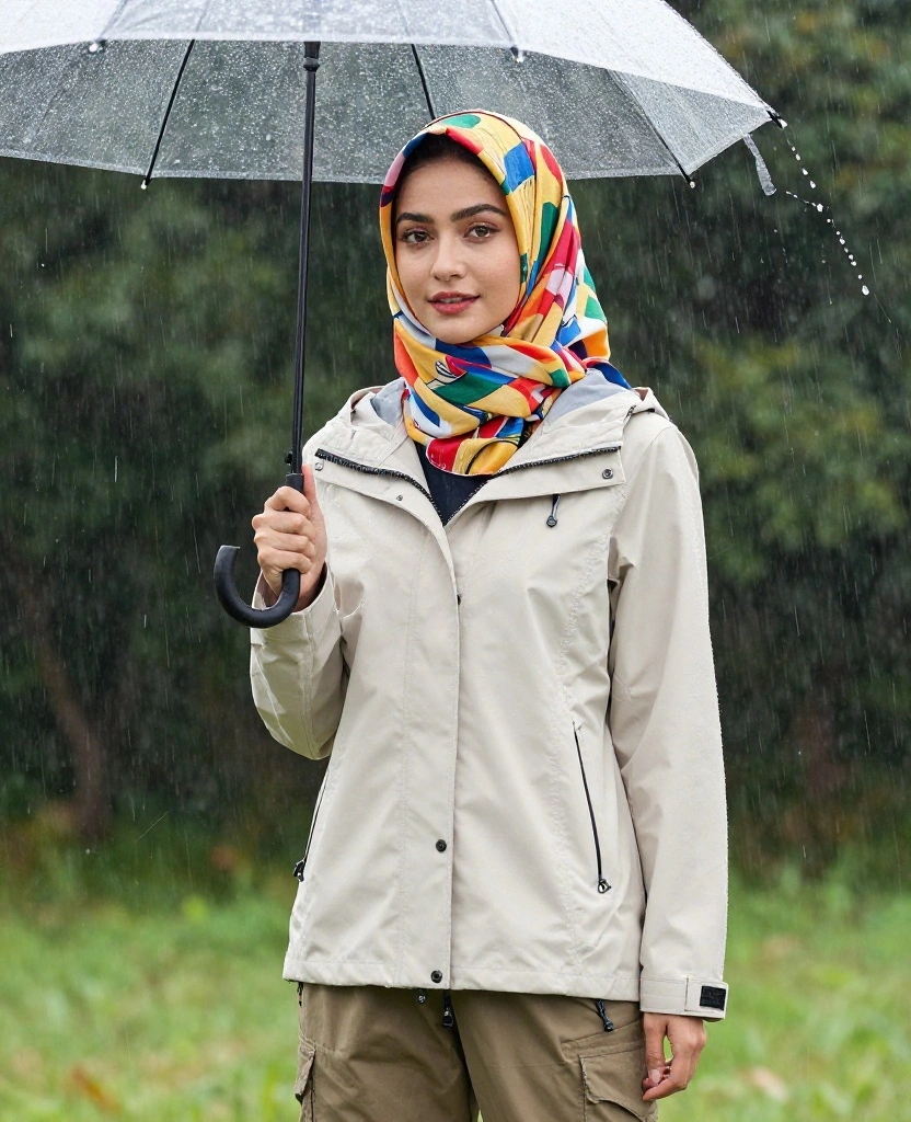 Opt for a patterned hijab that adds personality to your rain attire, ensuring you stand out even in gloomy weather. Breathable materials ensure comfort as you explore, rain or shine.