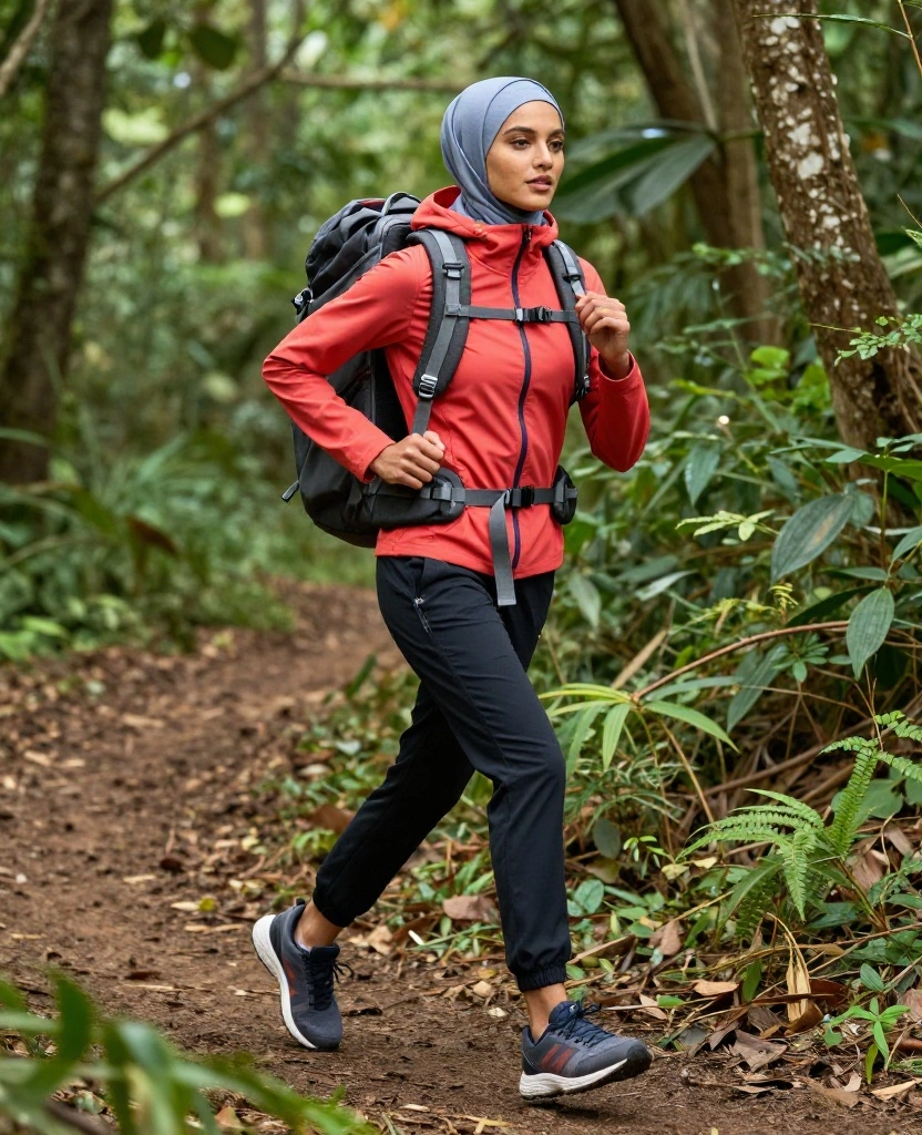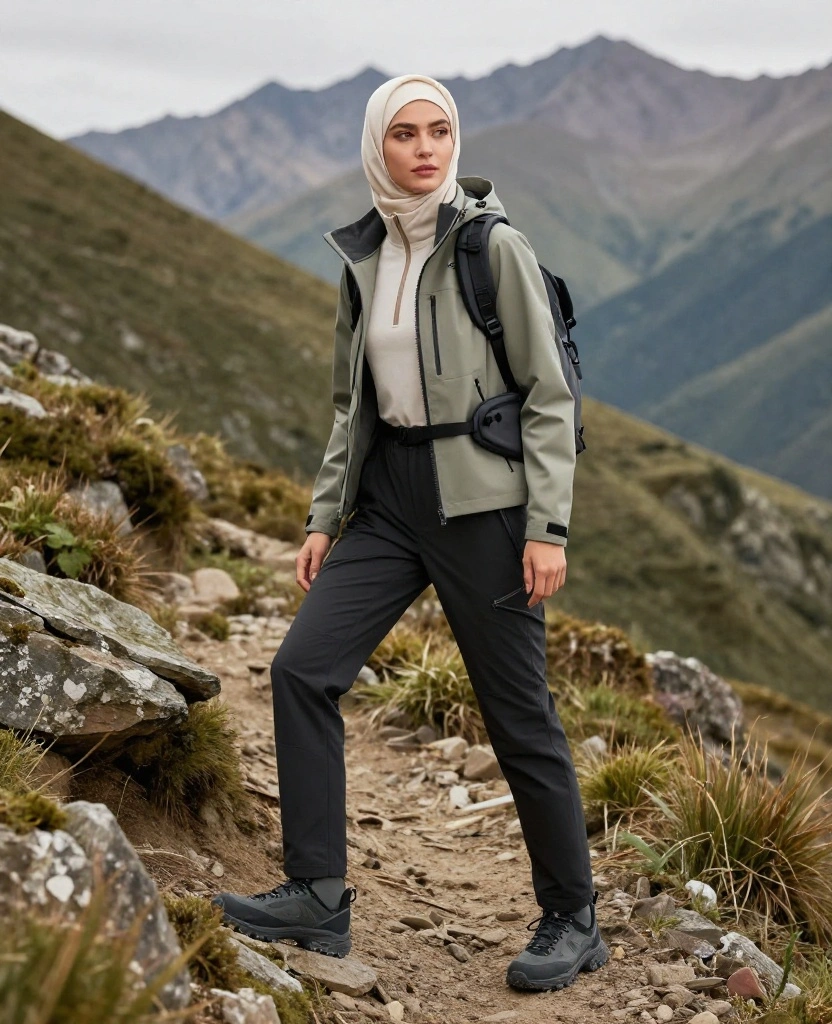 Enhance your hiking experience with a stylish ensemble that merges practicality with trendy elements. Start with a moisture-wicking long-sleeve shirt, paired with high-performance hiking pants made from recycled materials. A lightweight, patterned hijab adds flair, transforming your outfit into something more than just functional.