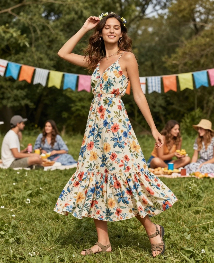 For a feminine touch, pair a flowing floral maxi dress with practical hiking sandals. This outfit embodies summer vibes and is great for outdoor events, allowing you to express your style while staying comfortable. The soft, breathable fabric of the dress makes it perfect for dancing or walking around.