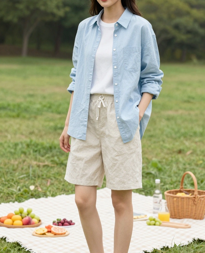 This outfit is both practical and stylish, making it a go-to choice for summer adventures or outdoor gatherings.