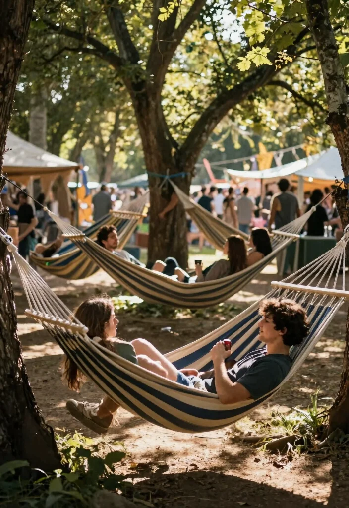 Lounging in a hammock lets you recharge while enjoying the festival vibe!