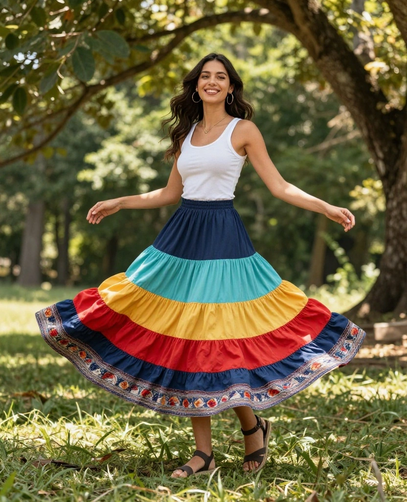 – Layered maxi or midi skirt (in bright colors or patterns)