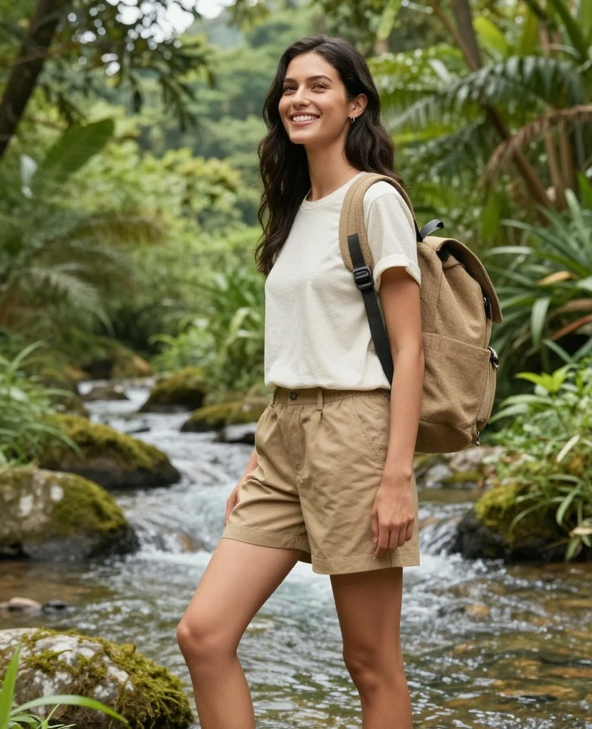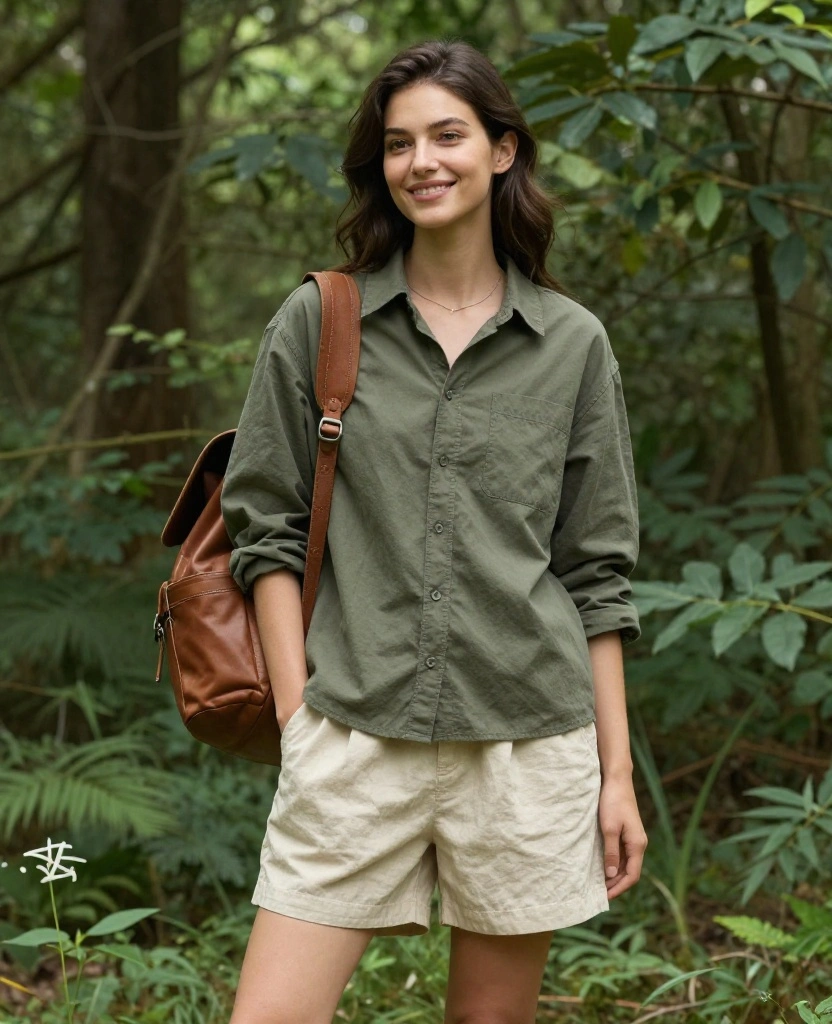 Consider a relaxed-fit cotton shirt paired with comfy joggers or linen shorts for ease of movement. This outfit is stylish yet practical, perfect for an adventure-filled day.
