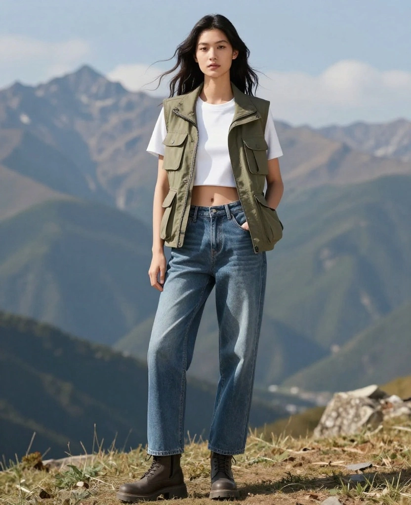 Pair your vest with a simple crop top or long-sleeve shirt and straight-leg jeans for a well-balanced look. This style nods to urban aesthetics, making you feel chic while enjoying nature.