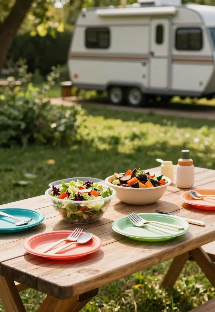 Pick lightweight options that won’t take up too much space in your RV. Bright colors can add a fun touch to your table setting. After your meal, a quick rinse or wipe keeps them ready for the next adventure.