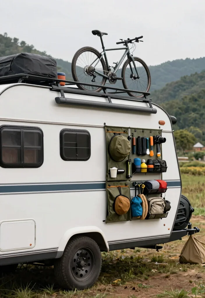 A roof rack is a fantastic way to store larger items like bikes or kayaks, allowing you to save interior space for essentials. Setting up a wall organizer near your trailer entrance can also help keep outdoor supplies easily reachable.