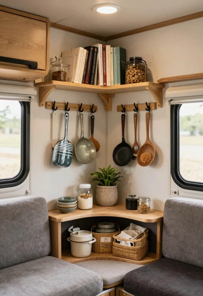 Every little space in your travel trailer can contribute to storage! Don’t underestimate the potential of nooks and crannies. Adding corner shelves can hold books or decorative items, while hooks inside cabinet doors can store pot lids or cutting boards.