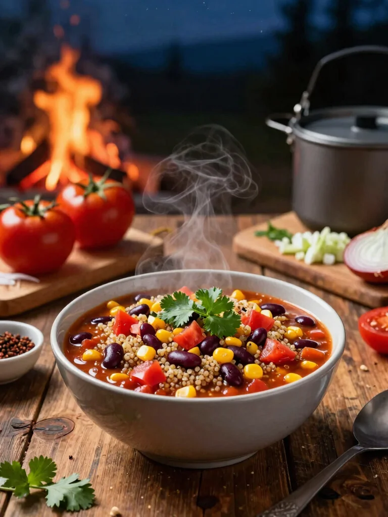 Prepare meals like Hearty Quinoa Chili ahead of time for easy, filling options while camping.