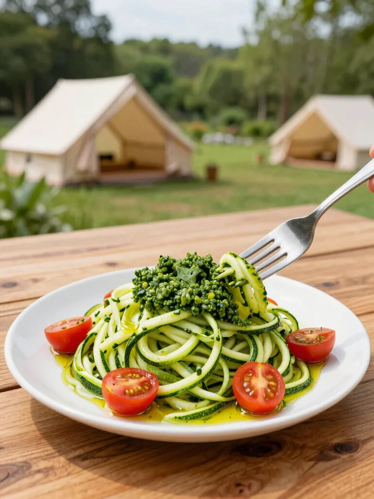 Zucchini noodles with pesto prove that light meals can feel gourmet after a long day outdoors. Spiralize at home, stash pesto, and you’ve got a 15-minute vegetarian camping meal—one of those reliable vegetarian camping meals that beats heavy pasta every time.